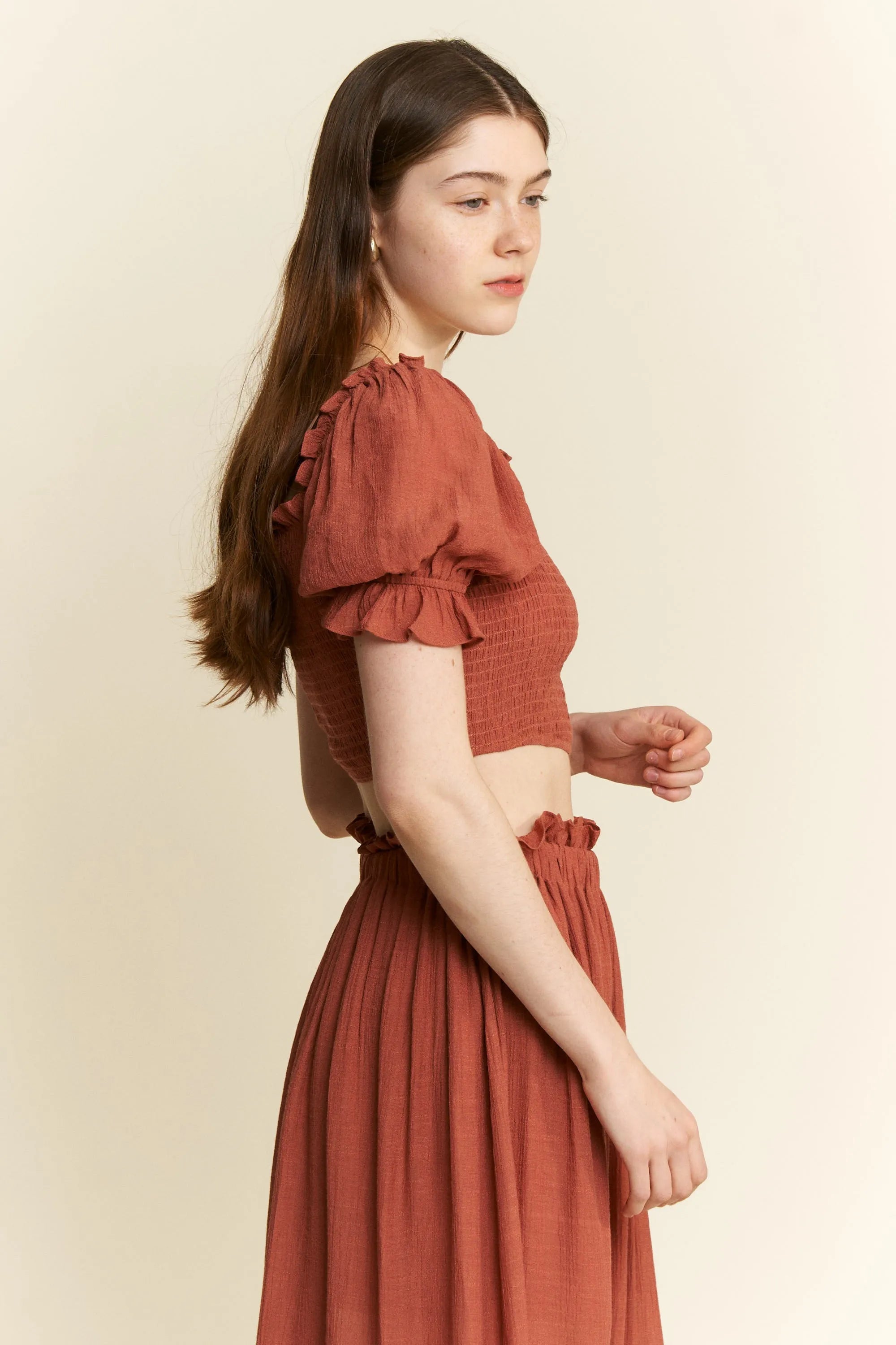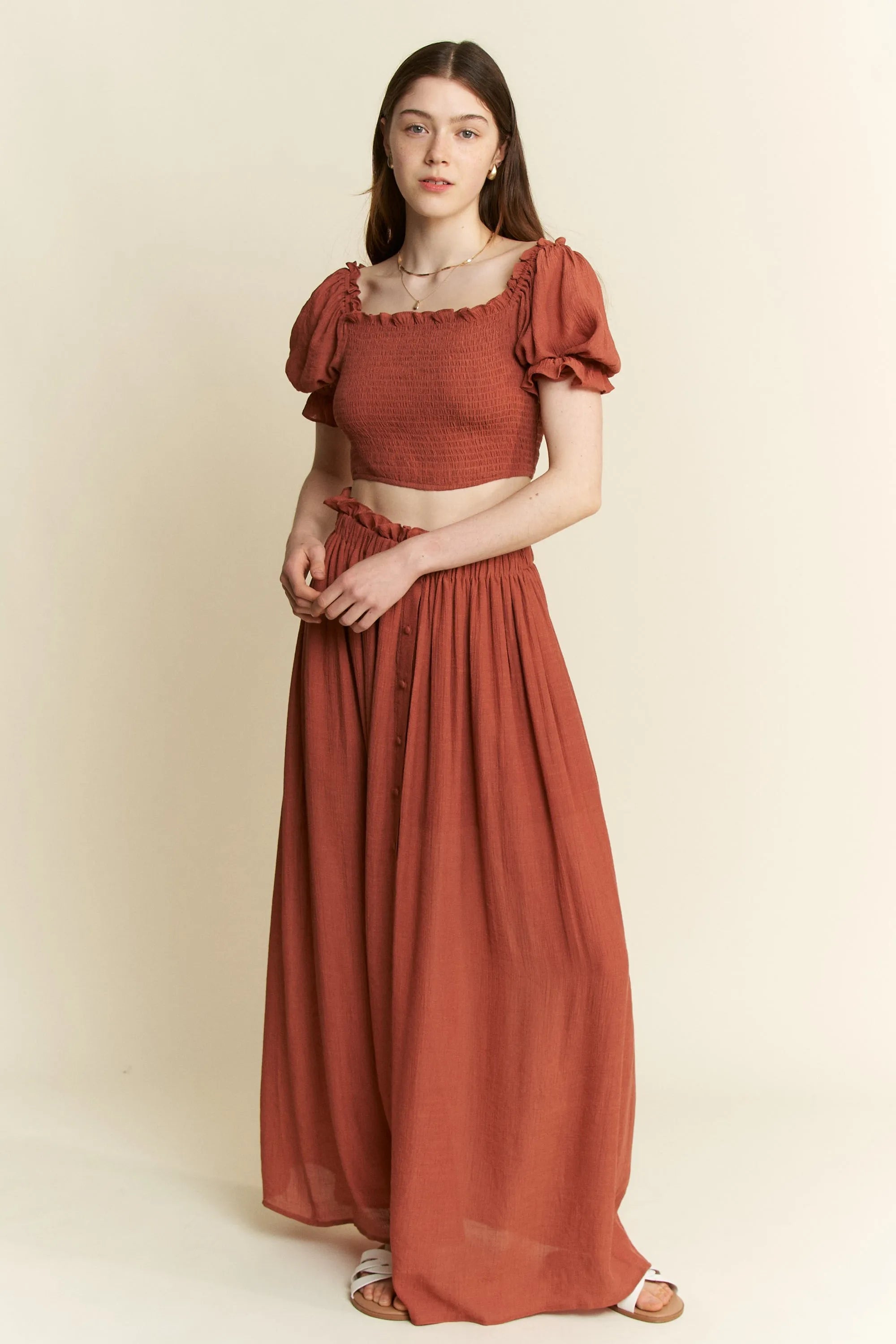 This enchanting maxi dress combines vintage charm with modern comfort. Crafted from a soft cotton-blend fabric, it features a flattering square neckline adorned with delicate ruffles and statement puff sleeves. The rich terracotta color adds warmth to any wardrobe, while the flowing A-line silhouette creates an elegant and timeless look. Perfect for various occasions from casual daytime events to romantic evening outings. The dress's construction allows for comfortable movement while maintaining a sophisticated appearance.
